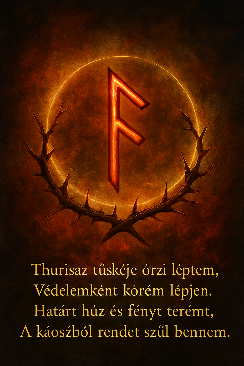 "Thurisaz tüskéje ébred, Védelemként körém léphet. Határt húz és fényt teremt, A káoszból rendet szül bennem."