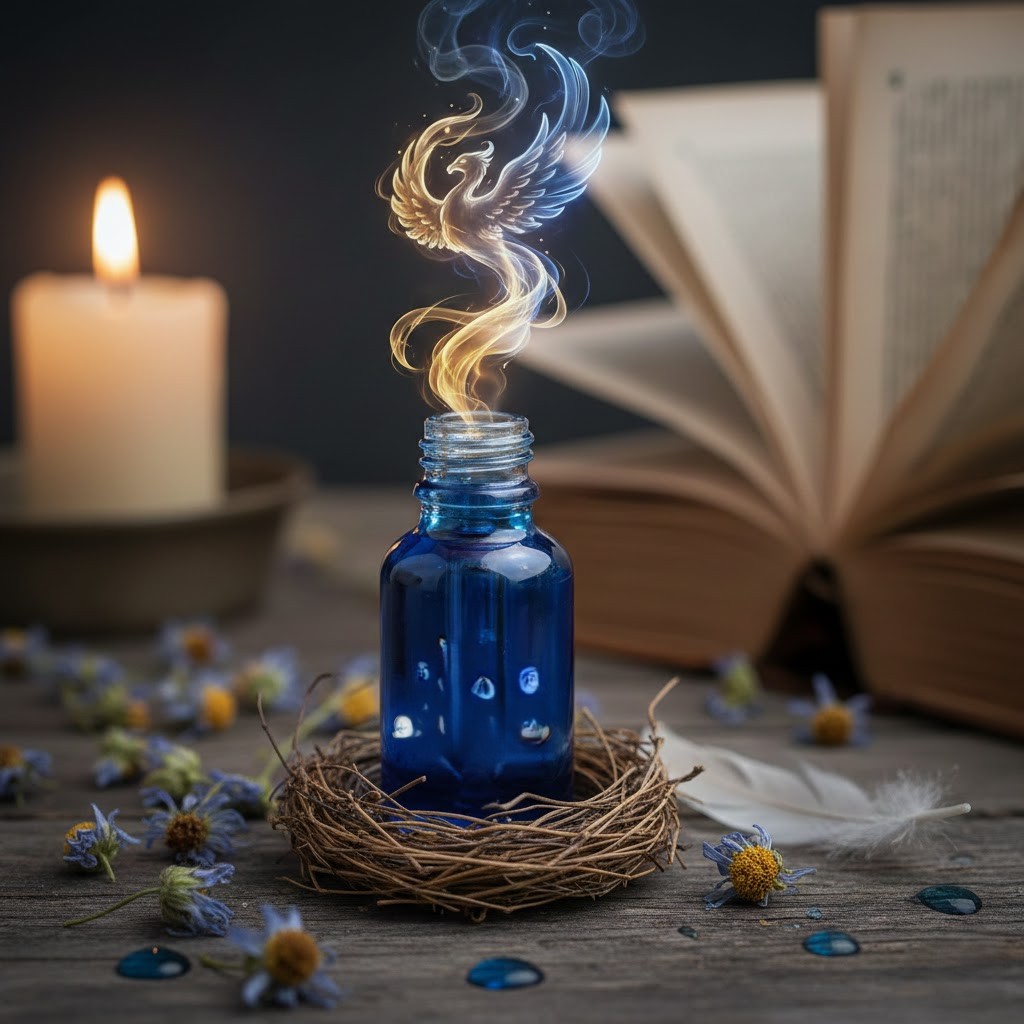 Ez az esszencia a kettő találkozása: a lángok elcsendesítése és az újjászületés előkészítése. Amikor a bőrre kerül, nem csak a testet érinti meg. Lecsillapítja a lélek hullámait, kisimítja a belső feszültséget, és megnyitja azt a teret, ahol a Főnix újra felemelkedhet — szelíden, békében, önmagára találva.